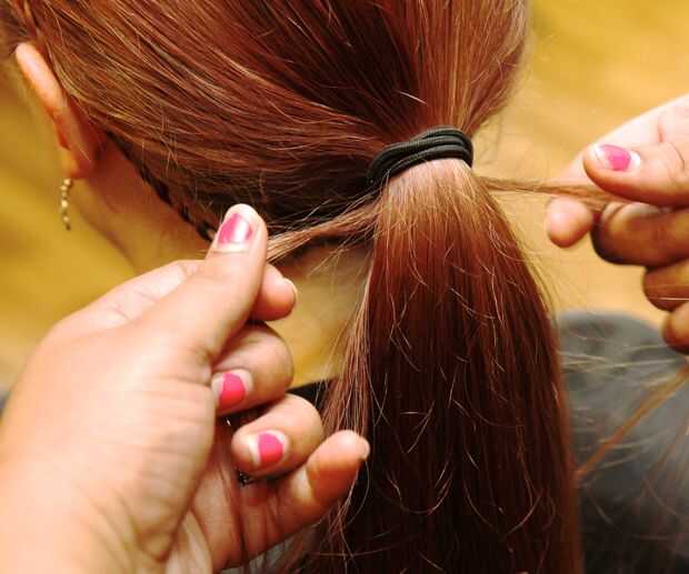 Tomar la hebra pequeña detrás de la cola de caballo, llevarlo a la cima y cruce la cola de caballo. Se puede ver usando su dedo para mostrar la X que se crea.