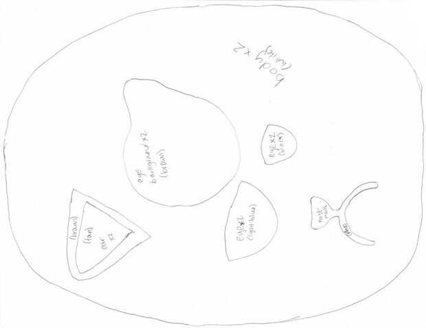 blanco 2 hojas de fieltro, fieltro marrón 1 hoja, fieltro tan 1 hoja, fieltro de 1 hoja de rosa, fieltro azul 1 hoja, fieltro negro 1 hoja, hilo, aguja hilo blanco, negro, pegajoso pegamento (opcional), alfileres, tijeras, poly-fil y una máquina de coser.