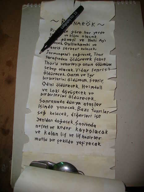Utilizar el marcador negro o una pluma para escribir las escrituras en su desplazamiento. No tienes que hacerlo nórdicos, cualquier cosa medieval sería bueno mirar. En este caso vamos a escribir sobre el Ragnarok en runas nórdicas.