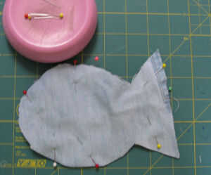 Pin juntos todo los peces los peces delantero y espalda, asegurándose de que la cola y la aleta son metidos.  Deje una 4" de apertura en la parte inferior de los peces.  Coser alrededor del borde externo de los peces utilizando el pie de presión como su guía. No te olvides de dejar la abertura.
