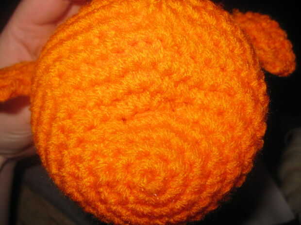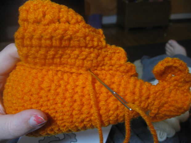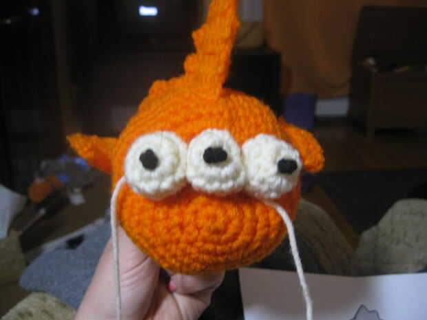 Ahora, para coser en los ojos, primero quería forma los peces, por lo que tiene una especie de estante para los ojos descansar en el. Tomar el hilo naranja, ir hasta la parte inferior, a la parte superior, en la parte superior, hacia atrás y hacia fuera la parte inferior cerca de la entrada. Atar el hilo firmemente, para dar a los peces algunos de forma. Tejer en los extremos. Mira las fotos de referencia.