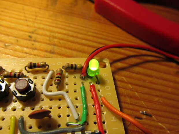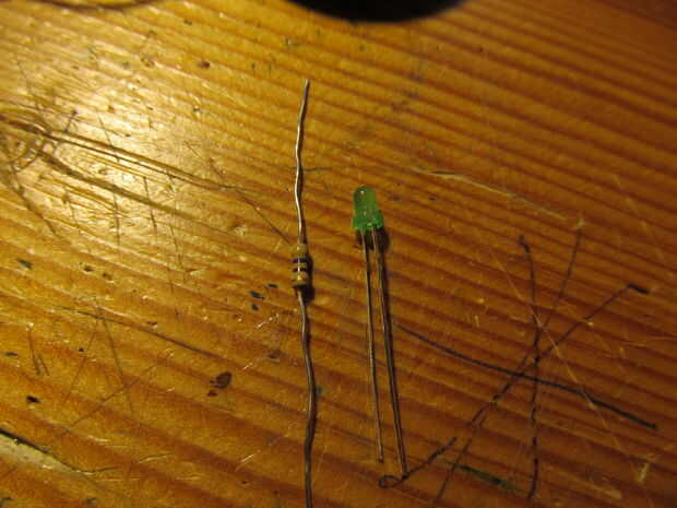 Añadiendo un led que indica cuando está encendido es útil ya que este circuito da de ningún sonido cuando no se jugaba, un led detenerte olvidar apagarla. Plomo de soldadura resistr al borne positivo y el otro extremo a la positiva del led (uno más). Luego tomar el otro cable y soldadura en el suelo. el led se encenderá cuando el dispositivo esté encendido