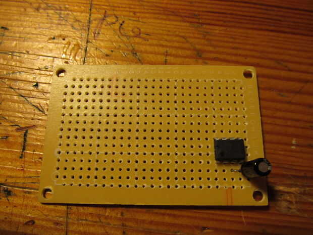 sueldan el ic directamente sobre el tablero, habría sido más sensato utilizar un zócalo para conectar en pero este paso no tengo one.in también soldar el condensador 10u en el pin 3, están conectados por un puente de soldadura en la parte inferior del tablero. Tenga cuidado con la polaridad del condensador, el más largo es el extremo positivo y esto está conectado a la clavija 3, el extremo negativo también tiene una franja gris a mostrar su negativa, poniendo en el camino equivocado redonda puede dañar el condensador.