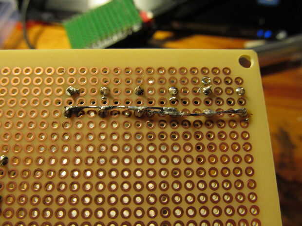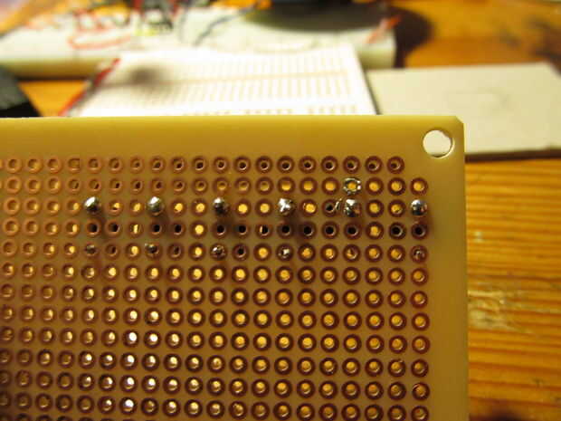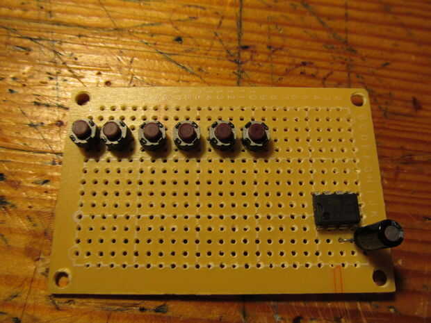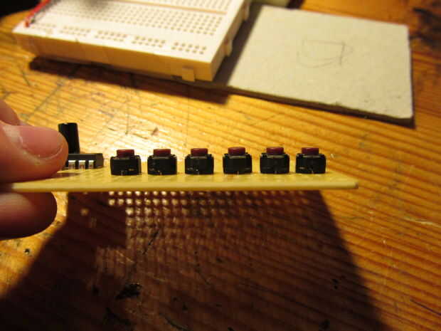 yo primero poner los botones en una línea en la parte superior. que había que dejar sitio para que las resistencias ir a lo largo de la parte superior así que salí dos filas repuestas arriba los buttons.i utilizar los cables que había corte del condensador a conectar los negativos de los botones.