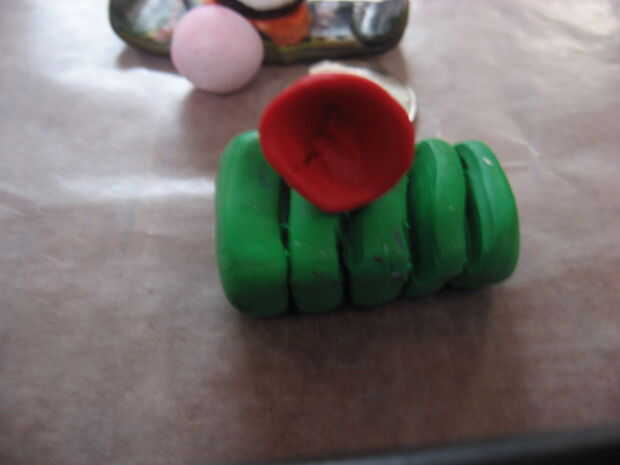 Tomar la bola de arcilla roja y hacer la parte superior en un punto, aplanar la parte inferior y la parte superior al lado de la curva un poco. Ahora tienes la forma de su sombrero básico. Para hacer que cabe en la cabeza de pingüinos mejor hueca el interior como una olla de presión. Ignorar la arcilla verde en la última foto.