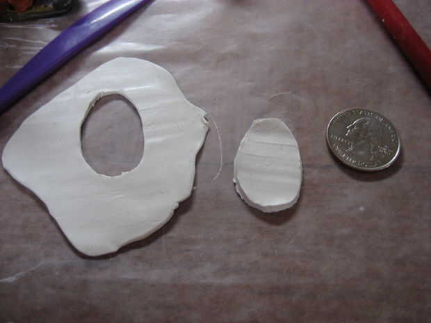 Hasta ahora realmente no parecía muy parecido a un pingüino. está a punto de cambiar. Tome un pedazo de arcilla blanca y aplanar hacia fuera. corte por lo que es una forma ovalada a más pequeña que el estómago de pingüinos. luego moldearlo en donde usted quiere el frente a. Luego, tomar un pedazo más pequeño de arcilla blanca y aplanar hacia fuera. cortar en una pieza redonda y poner en la cabeza de pingüinos.