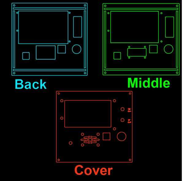 Para hacer todo más agradable estéticamente, que quería la tapa para ver bien. Su propósito funcional es retener la hoja del policarbonato en su lugar y proporcionar los agujeros para los botones adjuntar a. El hols internos para la pantalla y el altavoz son más anchos que las cabezas de los tornillos, por lo que los tornillos se parecen ser "hundida" en el caso. Nada mucho más que decir, la tapa del altavoz es un pequeño logotipo de Vault-Tec poco y hay unos símbolos grabados cerca de los codificadores rotatorios para marcar su propósito futuro como las perillas de entrada.
