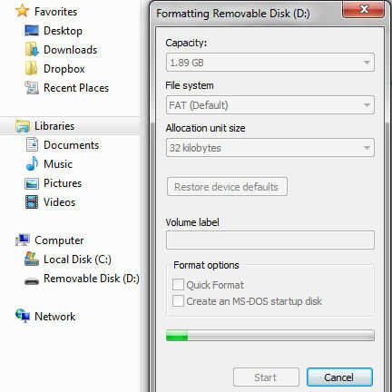 Antes de que podamos subir un montón de imágenes a la tarjeta micro SD y conecte en pantalla, necesitaremos formatear la tarjeta. Según el la guía del usuario compositor gráficos, necesita hacer un formato completo, así que desmarca "formato rápido" y vaya por un tramo o snack. Mi equipo tomó unos 5 minutos para formatear completamente una tarjeta de 2GB.