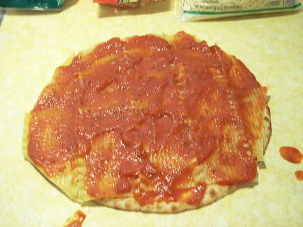 Aplique una capa delgada de salsa directamente en la corteza. Capa de tus tallarines cocidos encima de la corteza, cortar para ajustarse según sea necesario. Colocar capa más gruesa, otra de salsa sobre los fideos.