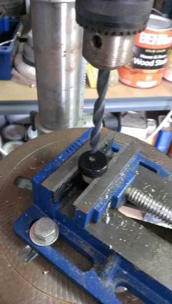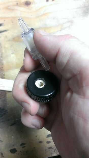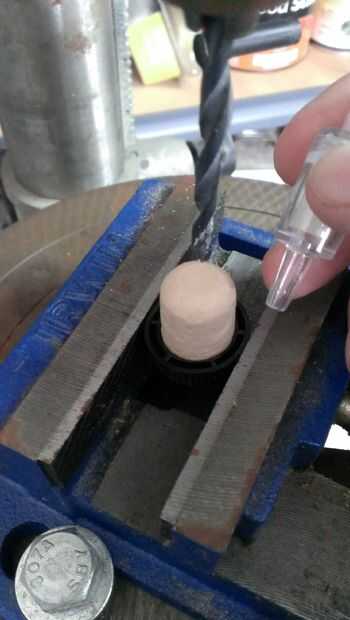 Alinee el tapa/tapón de modo que esté centrado y taladre a través de todo el camino. En este caso, desde elegí un tapón con una gorra negra en la parte superior, hizo un paso hasta el tope, entonces lo volcó y utiliza un poco más grande para ampliar a la parte superior del agujero sólo lo suficientemente profunda como para llegar a través de la plástica. Esto fue permitir que mi válvula penetrar tan profundo como sea posible en el corcho como material (digo corcho como porque éste era ése plástico esponjoso a menudo hoy en día encontrar en botellas de vinos y licores y es probablemente mejor para ello que corcho de todos modos).