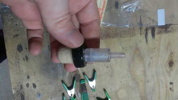 Después de que ha hecho el agujero a tu gusto, poner una pequeña cantidad de pegamento en la parte exterior del vástago de la válvula de retención (Asegúrese de que sabe usted cómo el aire fluye a través de su válvula de retención, desea que el flujo de aire de la botella al acuario, lo pegue y insertar en consecuencia) y trabajar en el agujero. No recomendaría poner pegamento en el agujero en primer lugar, es probable que solo te bloquea el orificio y el flujo de aire que necesitará más adelante. Trabajar el tallo alrededor un poco por lo que es el pegamento en contacto con el tapón alrededor de su circunferencia, pero no hacia la punta donde podría bloquear el agujero.