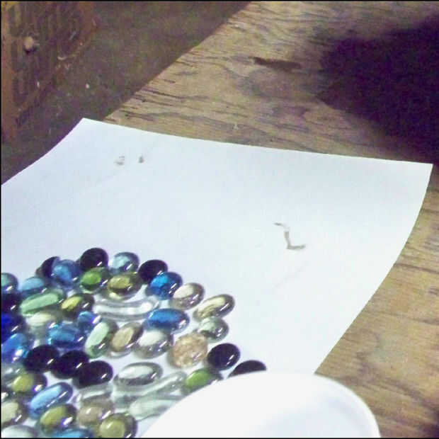 he decidido decorar el borde de mi taza con granos de cristal disponibles en cualquier tienda de artesanía.  Tuvimos algunos en mano, así que decidió utilizar para arriba. Usted puede esperar 45 minutos o así para hacer este paso, pero siguió adelante y terminó tan pronto como yo había vertido el hormigón.  Un diseño simple fue utilizado, pero probado colocarlos de una manera agradable a la vista.