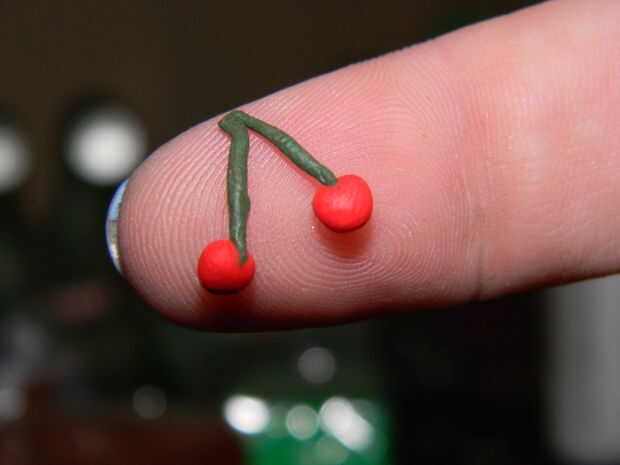 Luego forman dos cerezas pequeñas de arcilla roja y pegar los tallos en ellos.