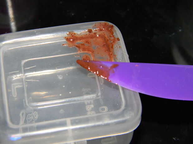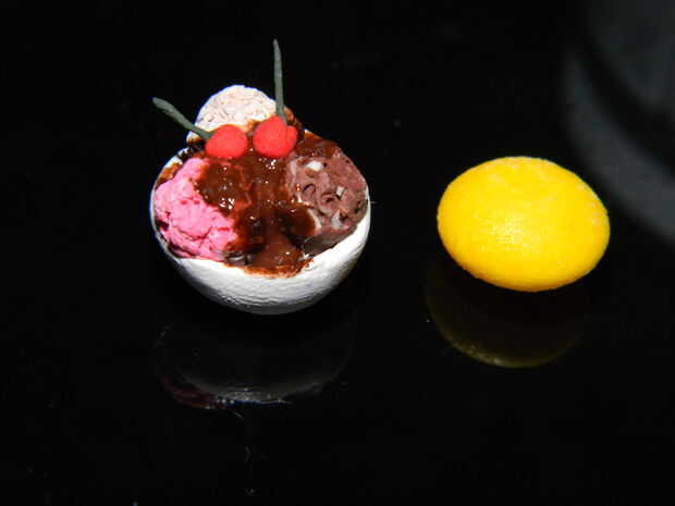 Para hacer un chocolate salsa mezcle una pequeña cantidad de pintura marrón con un acabado brillante. Esto hará que se vea todo brillante, melty y delicioso, este también actúan como pegamento para tus cerezas. Rociar la salsa de una manera realista, para el mio lo puse en el pozo del centro de los helados y tenido goteo hacia abajo de los lados.