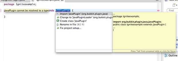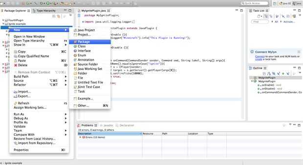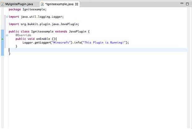 Derecha, haga clic en (haga clic control) la carpeta src en la carpeta del proyecto java. Nuevo > paquete y el nombre lo que se llamó la carpeta java del proyecto tiene que ser exactamente correcta, de lo contrario resulta demasiado confusa! Luego haga clic derecho sobre el paquete que acaba de hacer nuevo > clase nombre en el mismo como su paquete y proyecto Java y haga clic en finalizar. Luego debe obtener una pantalla con el nombre si tu plugin y algunas otras cosas. En la línea de clase pública edición decir clase (nombre del plugin) extiende JavaPlugin {después que debe obtener un error haga clic en el foco y haga clic en importar JavaPlugin (org.bukkit.plugin.java). Vas a estar importando un montón de cosas de bukkit así que asegúrate de que tienes el craftbukkit. Retorno exitoso entre las llaves tipo golpe de vuelta otra vez. Tipo público void onEnable () {vuelta de golpe y tipo Logger.getLogger("Minecraft").info ("este Plugin está funcionando!"); Luego salen que soporte rizado en espacio en blanco entre los dos. Luego presione tab.