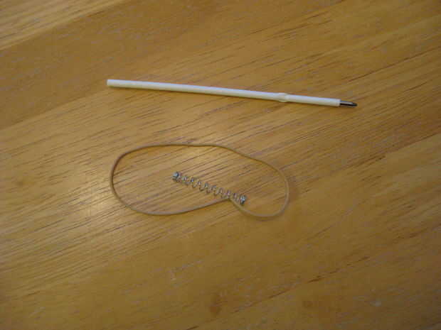 bueno este es mi segundo instructivo y mostrará usted cómo hacer una pluma arco y la flecha que dispara más de 30 pies y bastante precisa también. Lo que se necesita son: un lápiz, tijeras, una banda de caucho y algo para hacer un orificio a través d