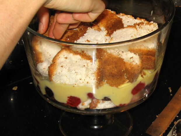 Ahora agregue otra capa de torta, rociar con licor, espolvorear con bayas y añadir más pudín y crema batida. Continúe hasta que hayas llenado de la Cuba de la bagatela o se quede sin ingredientes. Mi cuenco de bagatela celebró 3 capas de bizcocho y frutas, con dos capas de pudín y crema.