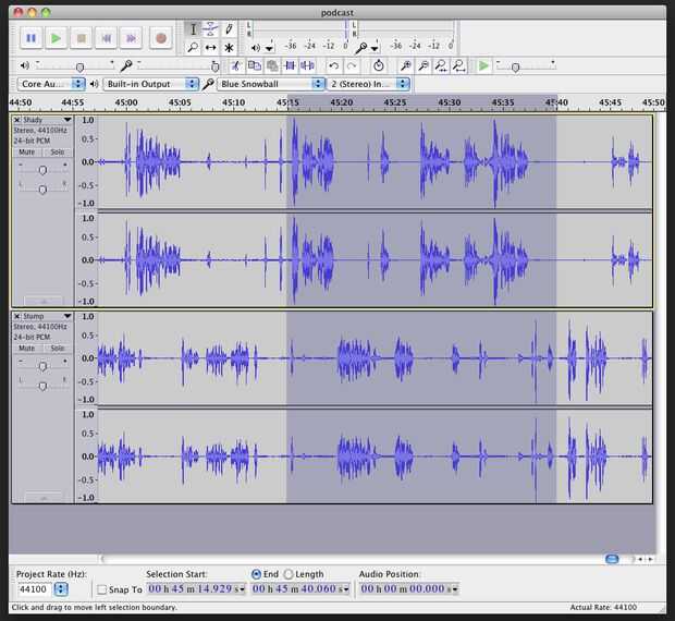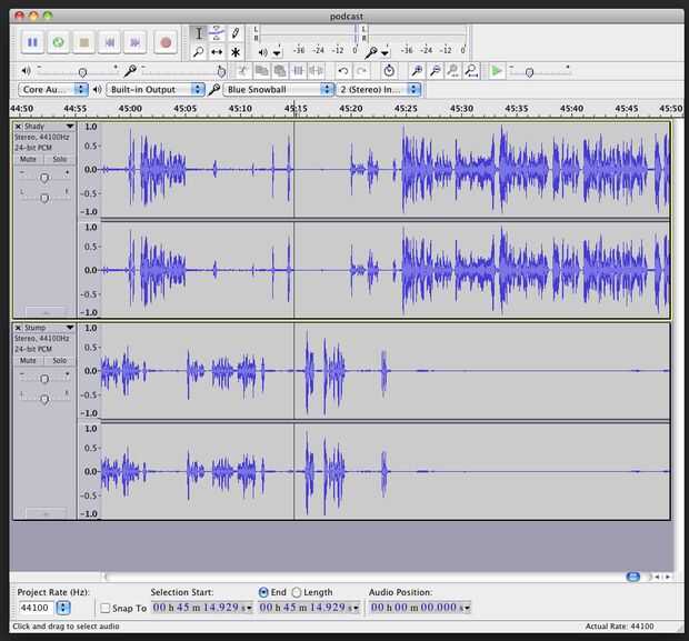 Cuando edito el podcast, escucho activamente a la pista entera. Hay un montón de largas pausas donde estamos tanto una preguntas de procesamiento, o pensando en la mejor manera de responder. Hay dos rutas que puede tomar, si no desea editar su pista puede rellenar con ruido y siempre hablar y usted puede hacer lo que hago y recortar más tarde. Después de que he terminado con la edición de la pista, en lugar de sonar muy reflexivo y pensativo en cada pregunta que sonido como saltar en el debate inmediato sin pensar y tener un fuego rápido y hacia atrás. Aunque esta es nuestra conversación, es un poco aceleró limitando las pausas justo después del comienzo de las preguntas.