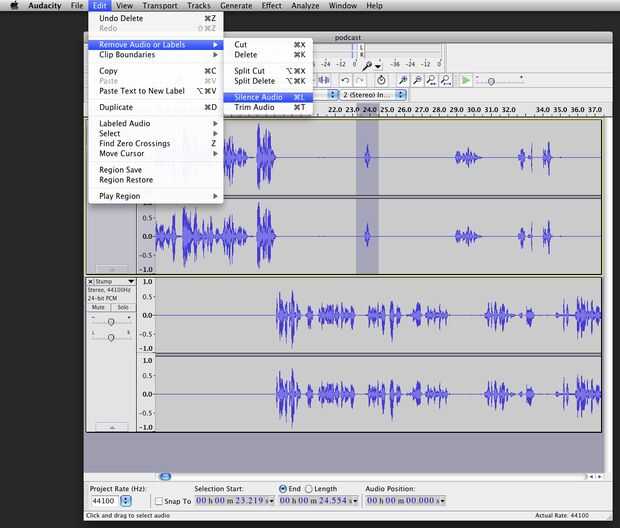 Por esta razón el silenciamiento de audio es útil. Si yo fuera a silenciar las mismas palabras en la frase anterior, quedaría con "El zorro". La zona donde brown rápida solía ser todavía está allí y la frase todavía toma la misma cantidad de espacio de una página, pero las palabras que quería quitar aún desaparecen. por silenciar el audio, se asegura que la sincronización se mantiene coherente entre personas hablando. Si eliminar un montón de tos de una persona y escuchar el archivo de audio y darse cuenta de que una persona es responder preguntas antes de que ellos piden, no es una buena cosa.