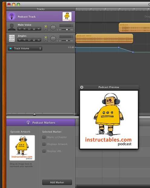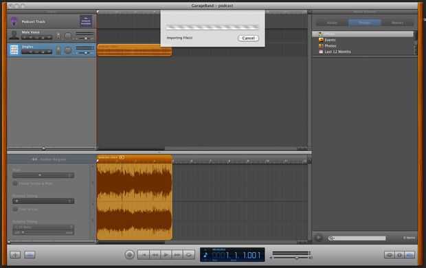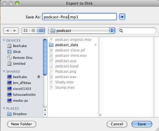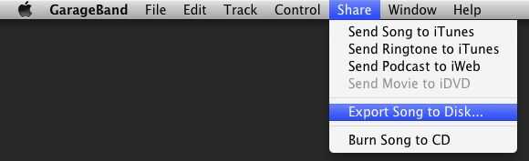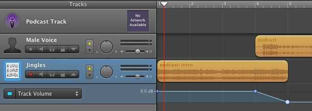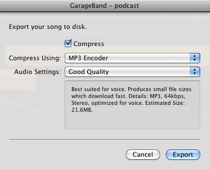 Después de haber el archivo wav, importar y la música de intro y outro en Garage Band. Hacer algunas modificaciones menores en las pistas (se descolora la música en la que habla y garantizar que ninguna pista es vista como más importante) y cuando todo es de mi agrado, exportar el archivo en un formato de audio comprimido (elegir mp3 ya que es el más utilizado).