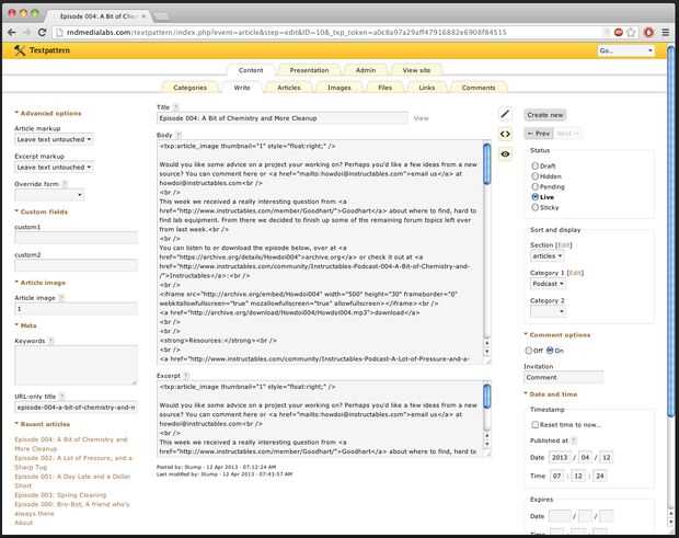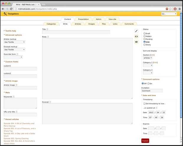 Así que realmente no quiero usar WordPress. No estoy seguro de que tengo una muy buena razón, no quería usarlo. He utilizado WordPress con ComicPress tema que yo totalmente modificado para requisitos particulares en el pasado, pero simplemente no disfruto de la interacción. He probado Drupal en el pasado así, y mientras que realmente quieres como eso CMS, solo no puedo llevar yo para entenderlo. Hace varios años, me ha pasado a través de algo llamado TextPattern, y me pareció bastante interesante. Decidí finalmente intentaría usar para este blog, y estoy estética que hice. Puede ser un poco más complicado en algunos aspectos y WordPress, pero el blog que tengo es más o menos el valor por defecto que TextPattern. No hay muchos temas y si usted quiere realmente cambiar las cosas, vas a tener que entrar en el código, pero si desea un blog básico, y no estaba pensando en conseguir también en el código de todos modos, funciona bastante bien. Estoy bastante seguro de que había una razón que empecé a decirle todo eso, pero vamos a suponer que es configurar la hora del cuento en el siguiente paso!