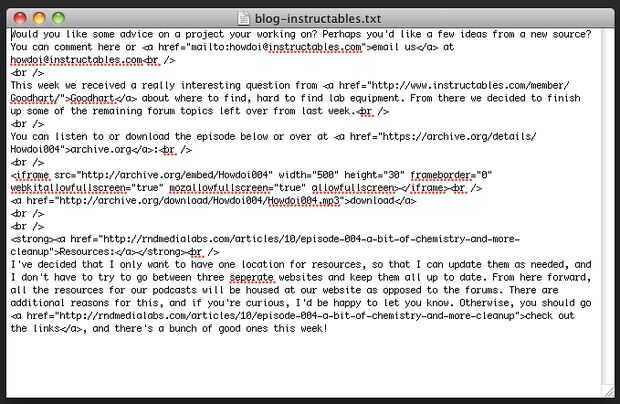 Con su mp3 en línea, ya sea que haya terminado con este paso, o todavía necesitas hacer tu blog post (hay una muy buena razón para hacer esto lo que llegaré a en el paso siguiente). Antes de publicar a cualquier sitio, preparo en un programa de texto exactamente lo que voy a escribir para cada post del blog. Archivo de Internet introduce automáticamente retornos de carro en el html, para guardar un archivo para ellos sin interrupciones en el código, a continuación, guardar un archivo de texto para mi blog y un archivo de texto para los foros de instructables (éste último dejé de hacer ya que me sentía como que estaba obstrucción la alimentación reciente en los foros).