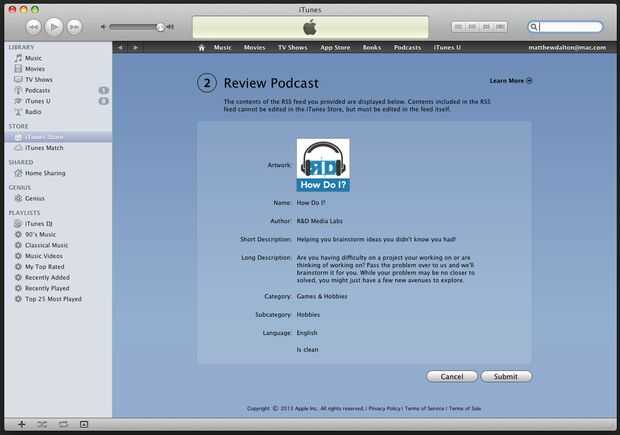 Hay solamente dos otros directorios de podcast que también debe tratar de entrar. iTunes, porque todo el mundo tiene un iPod y el Zune Marketplace, porque hay un montón de personas que tienen un Zune. Si le puede subir podcast a iTunes, se formatea correctamente para Zune. Las instrucciones para subir su podcast al iTunes mercado es un instructable en sí mismo. Cada software de blog va a tener requisitos un poco diferentes. Es importante saber cuáles son los requisitos de iTunes para su alimentación y adherirse a ellos. iTunes requiere etiquetas especiales para los rss (xml) de alimentación le dan a ellos.