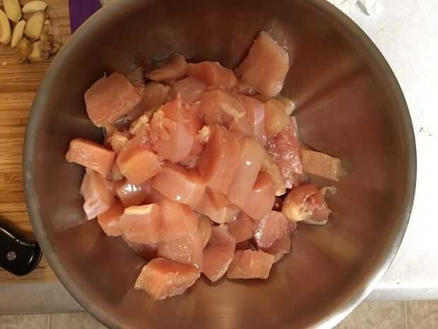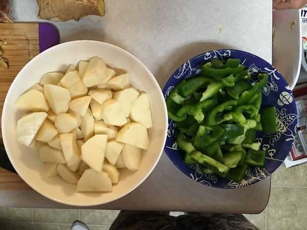 Antes de que ponga los ingredientes en la sartén, tenemos que cortar los pimientos verdes, patatas y pollo.