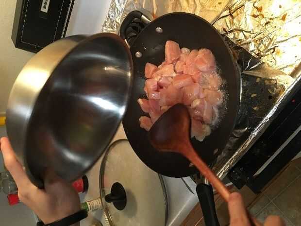 10. utilizar pala de madera o de plástico para voltear el pollo hasta que la TI se convierten en blanco en la superficie