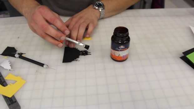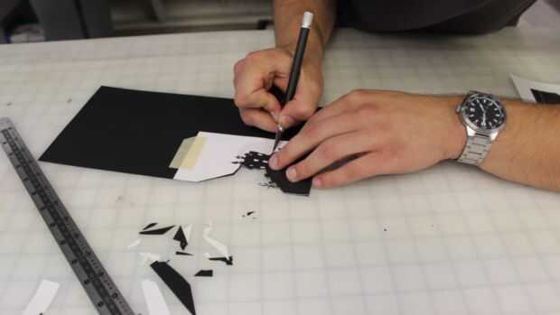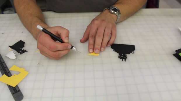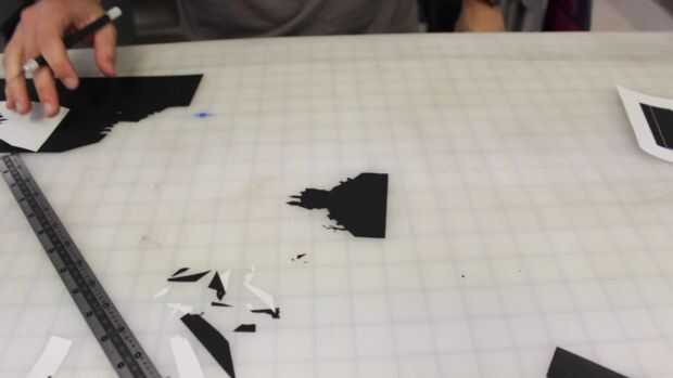 Corte la imagen de la casa de la plantilla y pegadas a un cartón negro. Entonces lo había trazado cuidadosamente con el cuchillo con el mayor detalle posible. Después de que la casa estaba cortada, he añadido algunas ventanas.