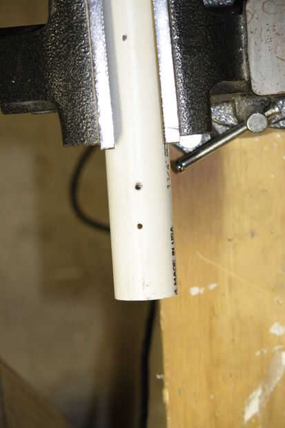 Alinee las piezas de PVC en ambos lados de la cubeta y marque en la PVC donde desea colocar sus tornillos, el botom perno de 1.5 pulgadas de la parte inferior del PVC y la siguiente una pulgada por encima del perno.  Luego haga agujeros en el PVC y el cubo.