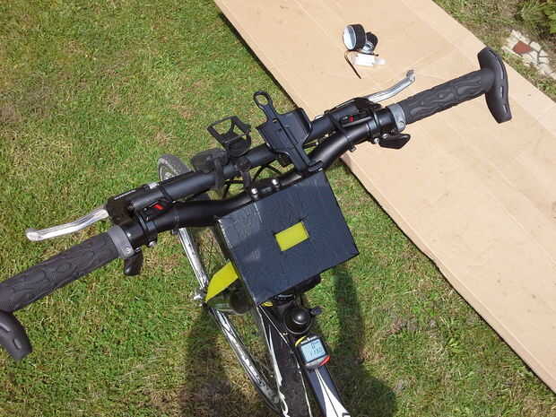 5. y 6. Sujete el portador - ve desde arriba y bajo. Sujételo con la franja amarilla por debajo del manillar. Trate de moverlo, debe ser cómodo con la manera en que se siente, si no fije más. El portador es flexible así que puede tomarlo.