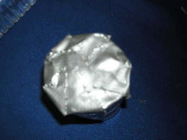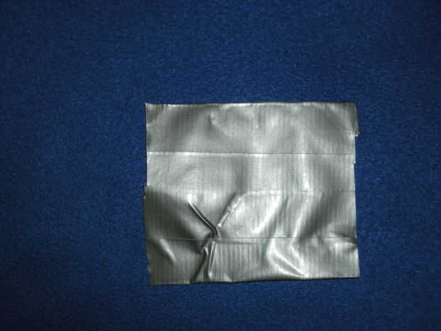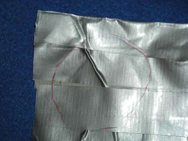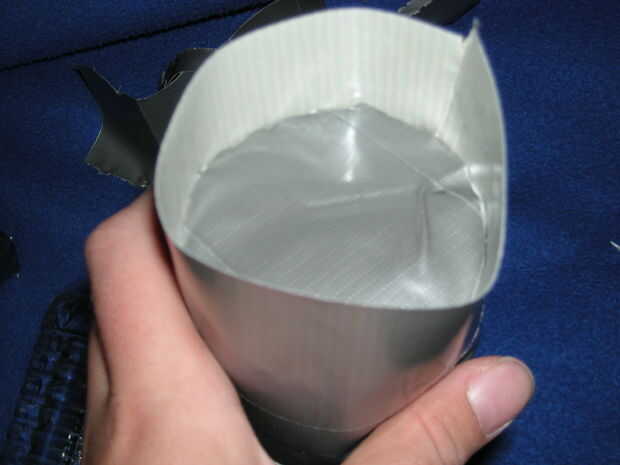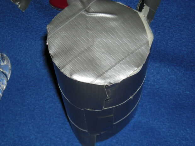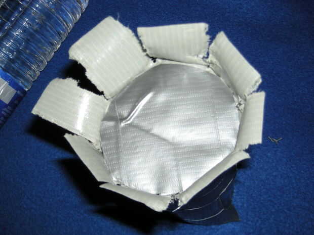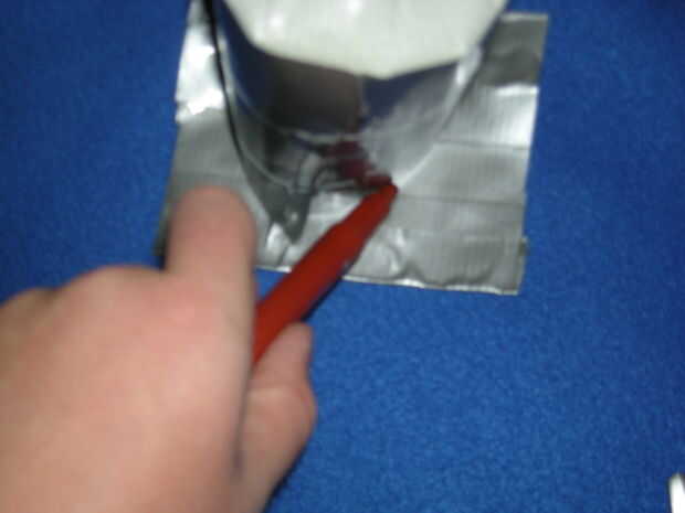 Ahora, debe hacer un trozo de tela de conducto "* que es de aproximadamente 3" por 3 "y poner el tubo en lado pegajoso hacia abajo. A continuación, corte alrededor del tubo para crear un círculo. Esta es la parte inferior, y debe presionar hacia abajo para la buena medida. Después de eso, cortar a un piee de cinta de unos 10" de largo y Envuélvala alrededor de la parte pegajosa con sobresale alrededor de la mitad como en la foto. Luego cortar en pestañas y doblar en la parte inferior del lacre