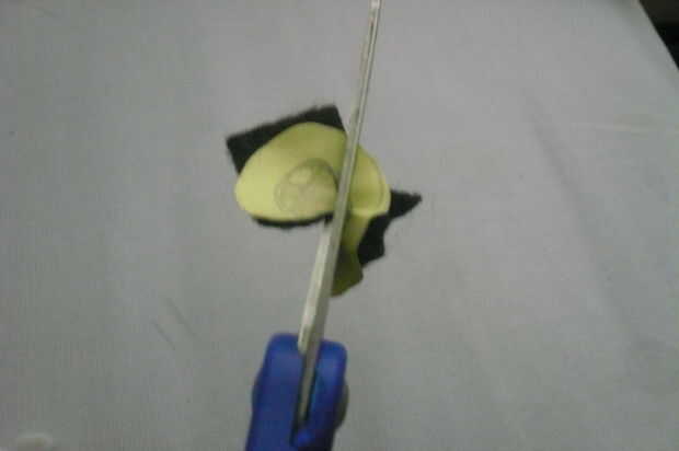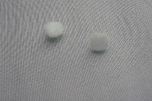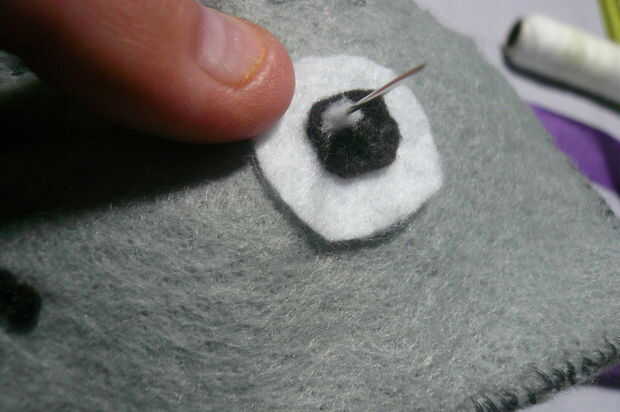 -Para los ojos: yo corte dos círculos de fieltro blanco. Luego, cortar dos círculos negros ligeramente más pequeños, y por último, dos pequeños blanco pedacitos de fieltro blanco. Para coserlos encendido, comienzo con el círculo blanco grande, poner en el círculo negro y luego poner en el destello. Coser todo con la misma puntada. En otras palabras, pila todos uno encima del otro en la aguja y luego la cosa en el.