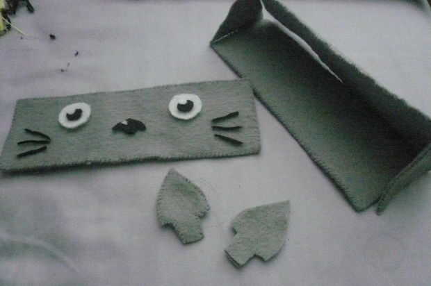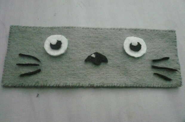 Por lo tanto, se puede bordar en unos bigotes con hilo solo negro. Es muy fácil: simplemente empujar la aguja a través de la parte posterior del rectángulo, traer al frente, recoger su extremo y se ríen detrás a través al otro lado del rectángulo. Y allí tienes una barba! Se puede repetir este proceso varias veces hasta obtener la cantidad deseada. Totoro tiene seis bigotes; dos de cada lado.