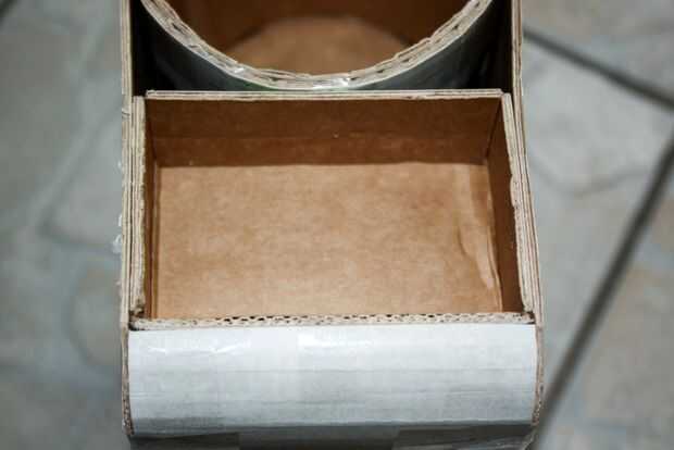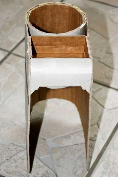 3. el cilindro y la caja le dará la longitud aproximada de la carcasa. Un pedazo grande de cartón en las piezas ya ensambladas y fijar con grapas y cinta en la parte superior. Dejar los extremos un poco más como se marca dónde cortar la carcasa en el coche.