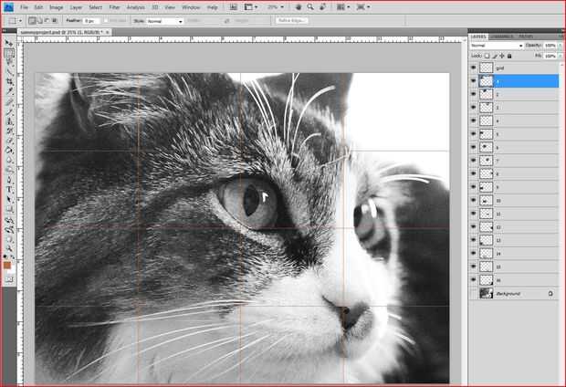 Use la herramienta recuadro rectangular para delinear el cuadro en la esquina superior izquierda de la imagen. Haga clic derecho dentro del área seleccionada y elija: capa vía copiar. Esto hará que su propia capa de la sección. Ahora hacer lo mismo para las secciones restantes del 15. Facilita las cosas etiquetar cada capa numéricamente capa de 1-16, 1 siendo la esquina superior izquierda.