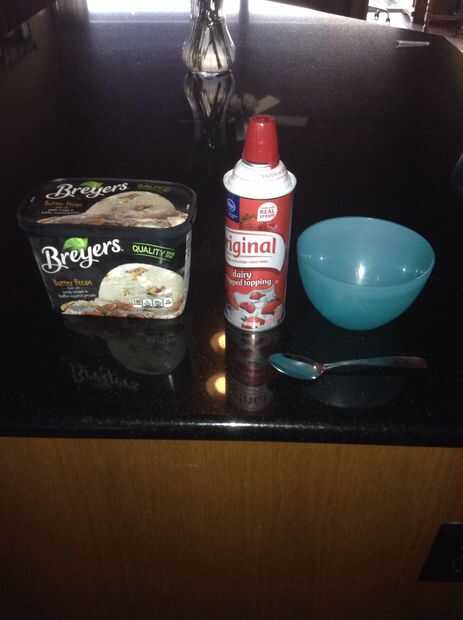 Se necesita hielo crema de cualquier sabor, nata, una cuchara, una cuchara de helado (opcional) un tazón de fuente y éter usted o alguien a comer la pieza principal.