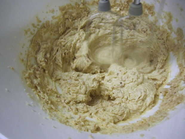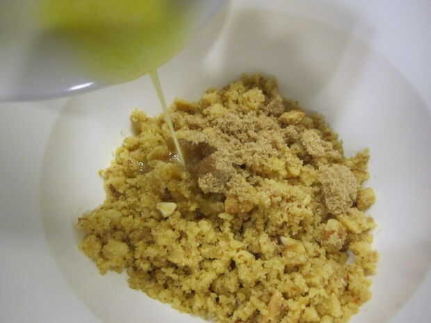 Hornear durante unos 10 minutos, los bordes deben ser marrón claro y la totalidad de la cookie debe estar cocida pero. Sacarlo del horno y deje enfriar. Desmenuzar la galleta suave en un recipiente y mezclar con la mantequilla derretida y el azúcar moreno (debe buscar como migas arena gruesas).