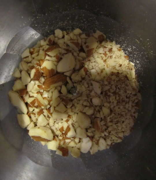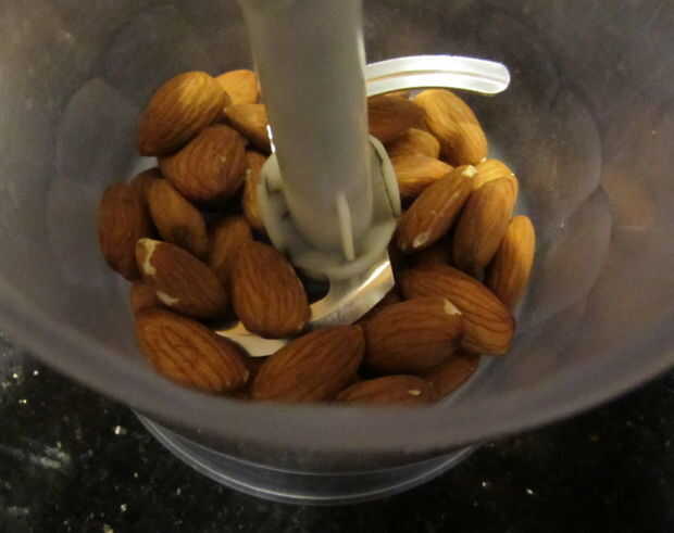 Precalentar el horno a 350° C. Tostar las almendras en una cacerola poco profunda sobre fuego medio hasta que estén calientes al tacto y los aceites ser lanzado (usted puede también brindarles en una bandeja a un horno precalentado a 350° C). Espere a que las almendras se enfríe y coloque en un procesador de alimentos pequeño proceso hasta que las almendras se asemejan a arena gruesa.