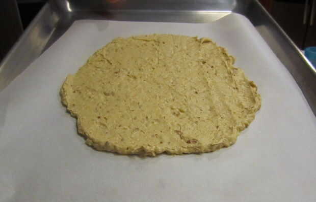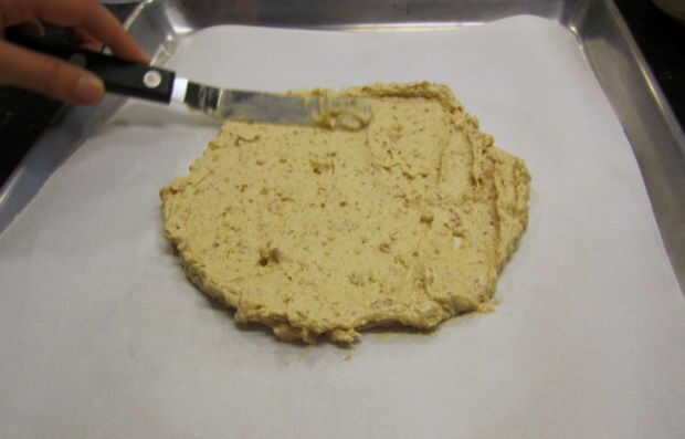 A continuación, coloque la mantequilla ablandada y ambos tipos de azúcar en una batidora con el accesorio de paleta o una batidora de mano, mezcla a velocidad media hasta ligero y mullido. Añadir el extracto de vainilla y el huevo y mezclar hasta combinar. Giro de la máquina y agregar las almendras machacadas, la harina, el bicarbonato y la sal. Mezclar a velocidad media-baja hasta que la mezcla se combina. Coloque una hoja de papel sulfurizado o un silicón estera en una bandeja de horno y extender la masa de galletas de almendras a un gran óvalo (la forma no importa mucho!).