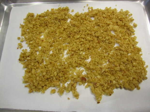 Colocar las migas en una bandeja de hoja cubierta con papel de pergamino/silicona y hornear hasta que estén doradas, unos 5-10 minutos. Sacar y dejar enfriar.