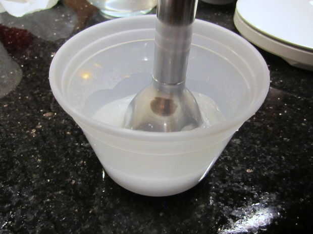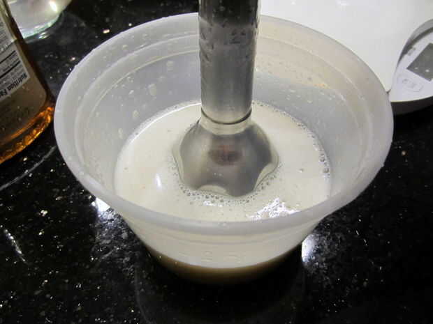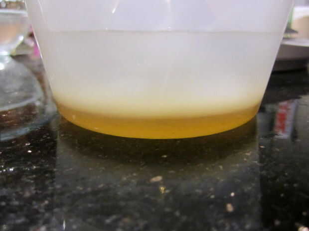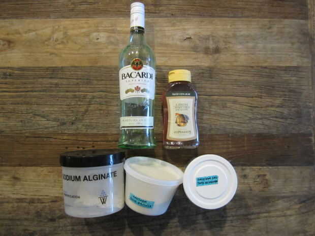 Prepare la bañera colocando el agua en una licuadora y añadir el alginato de sodio mientras la máquina está funcionando. La mezcla no debe tener ningún grumos. Es probable que se llena con muchas burbujas pequeñas, por lo que conviene reposar unas 2 horas en un recipiente, hasta que las burbujas desaparecen. Mientras tanto, coloque la miel, el lactato de calcio y el agua en un recipiente. Mezclar hasta que no queden grumos. Después se homogeneiza la mezcla, agregar el alcohol.
