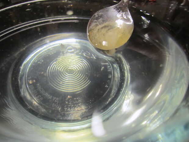 La mezcla de miel y el ron tiene que ser más viscoso que el baño para hacer las perlas fáciles de hacer, así que quizá quieras añadir media cucharadita de goma xantana para que sea más gruesa. Cuando llegue a la consistencia deseada, vaciar en un recipiente y espere hasta que la mayoría de las burbujas desaparezca. En la parte superior, probablemente habrá espuma, esto puede quitar con una cuchara y desecharla, porque el líquido debe ser como burbuja-libre como sea posible para hacer perlas claras. Tomar una medida de cucharadita curvado y rellenar con la mezcla de miel y el ron, con mucho cuidado y en un movimiento rápido, volcar el contenido en el baño (esto requiere algo de práctica, los primeros pueden parecer un poco raros pero lo pone más fácil con el tiempo!). Idealmente, las esferas no deben tocar en el baño de alginato de sodio. Dejar las esferas en el baño durante un minuto, retire y coloque en un recipiente de agua limpia para enjuagar. A continuación, almacenar en un poco de sobra mezcla de ron miel hasta que esté listo para usar. Miel emite luz visible, sin embargo he leido el color emitido fuertemente depende de la calidad de su miel: amarillo significa su miel es de alta calidad, verde no es!