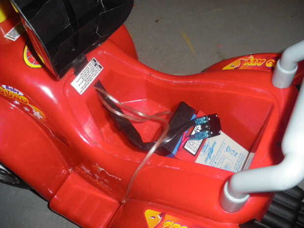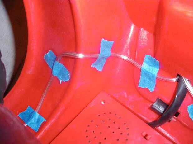 Una vez que los paneles solares están en su lugar, los pescados los cables a través del compartimiento de batería. Ruta de los que no van a conseguir colgado en ruedas o partes móviles. Sosténgalos en su lugar temporalmente con cinta de enmascarar.