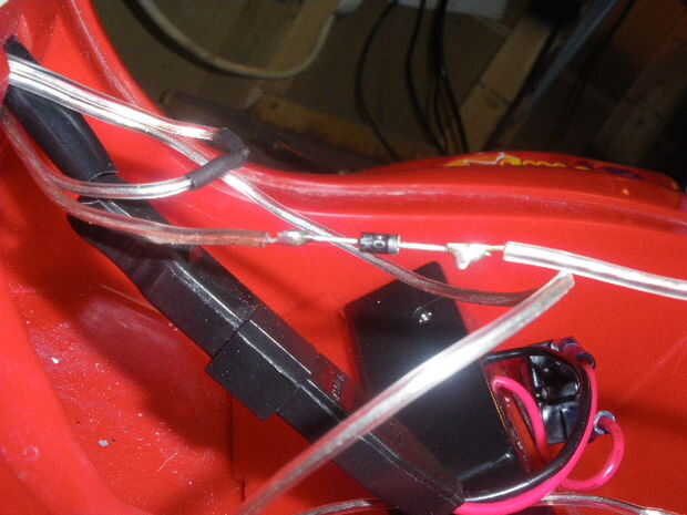 el diodo al final de la soldadura del alambre. Asegúrese de que la pequeña banda blanca apunta hacia la batería (y de los paneles solares). Es una buena idea para cubrir el diodo, por lo que no corta por cualquier cosa. Envuelve en tubería del encogimiento del calor.