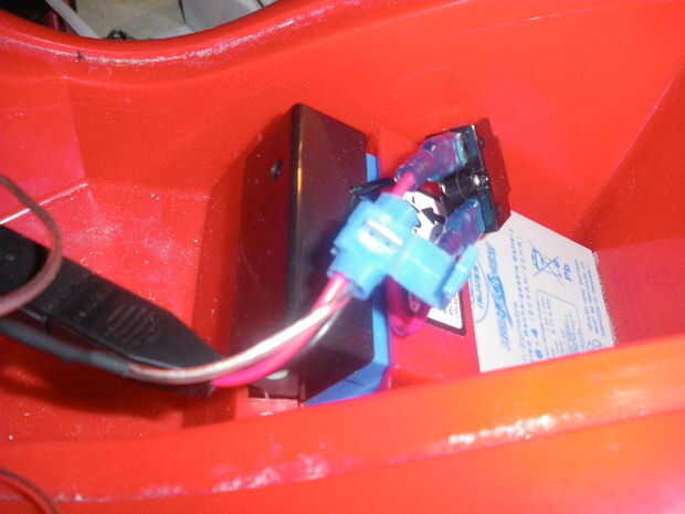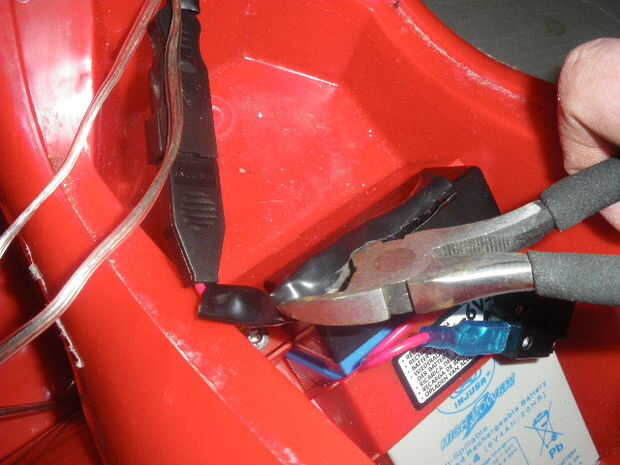 Ahora complete el circuito enganchando hasta la batería. Quitar un revestimiento de plástico y encontrar los principales cables a la batería. Entonces simplemente conecté mi + - cables y a los + y - los cables de la batería. Conectores Scotch Lock son una manera simple de hacer esto.