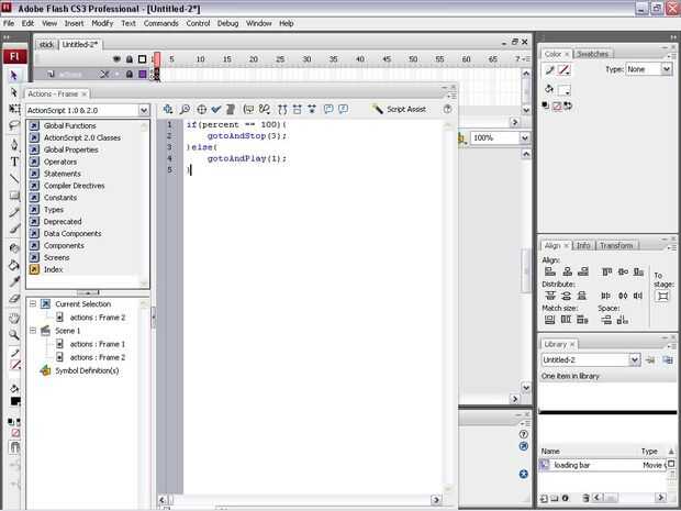 Este código hace un "loop" hasta que el flash está completamente cargado. Si la variable % no es igual a 100, continua a marco uno hasta que quede. Es prácticamente sólo comprobar si el flash está cargado hasta que se.