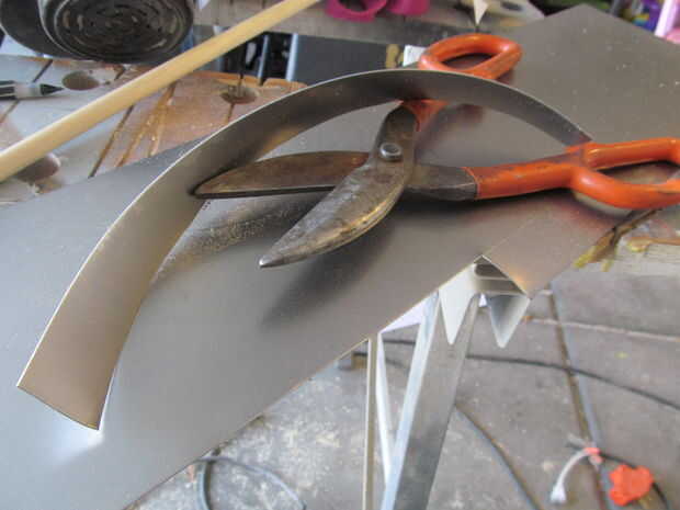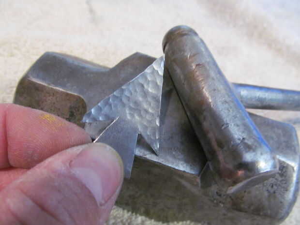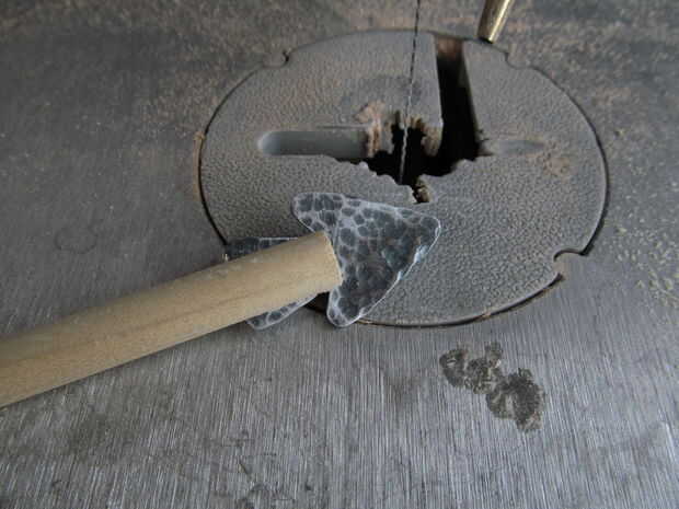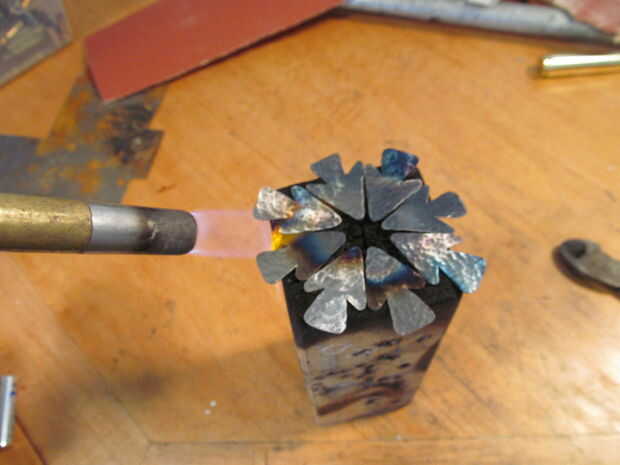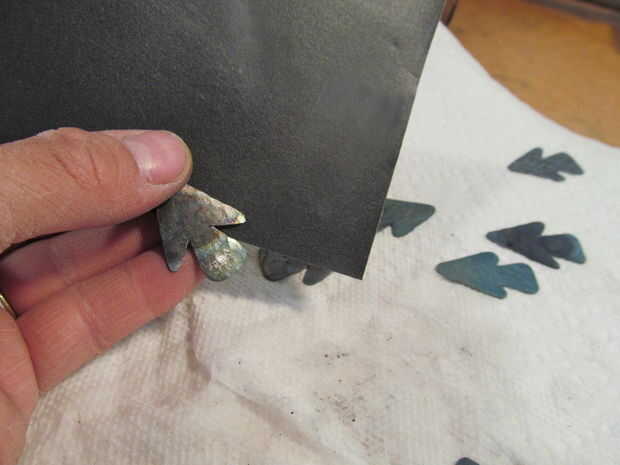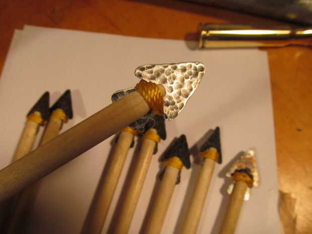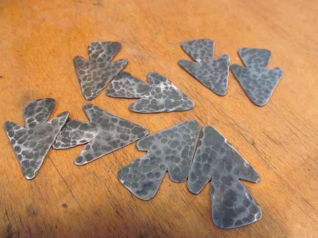 Hacer una silueta como si fuera un corazón de papel. Trazar sobre el metal y recortarlo. Utilice un martillo de bola para el metal de la textura. Calentar todas las puntas de flecha con una antorcha hasta que se descolorarán. Utilice papel de lija para eliminar algunas de la oxidación de la superficie. Afile los bordes afilados. La espiga en el extremo donde la punta de flecha se va a ir de la forma cónica. Use una sierra de contornear para cortar una ranura en el extremo de la espiga. Coloque la punta de flecha en la hendidura y ate con un nudo constrictor. También apliqué algunos pegamento caliente en la parte posterior.