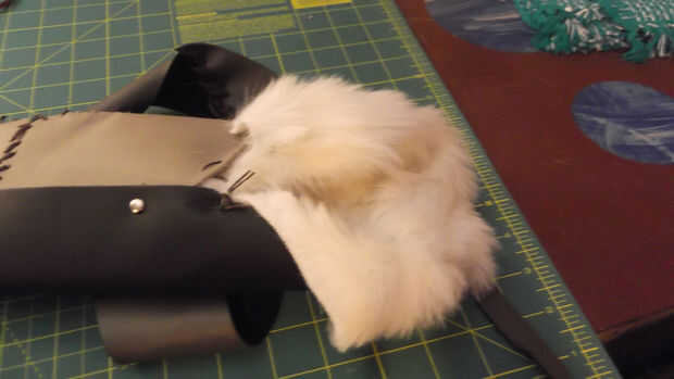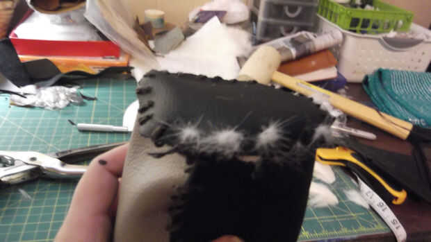 Para agregar la piel en la parte superior, corte un pedazo de piel que fue de 8 por 10 pulgadas lugar dentro de la tapa y arreglarlo te. Yo mío curvo sobre el borde de la aljaba. Luego cosió la parte superior de la piel en lugar perforando los agujeros en la parte superior de la aljaba y la costura a través de la piel.